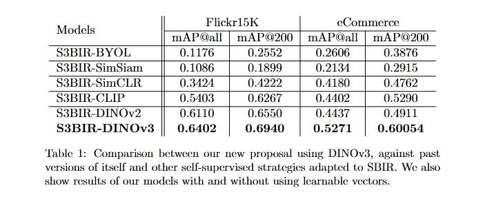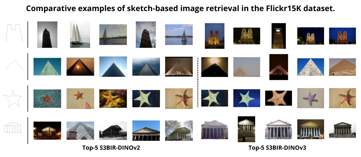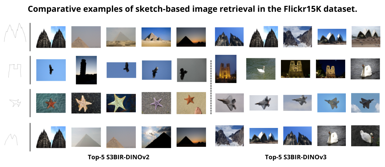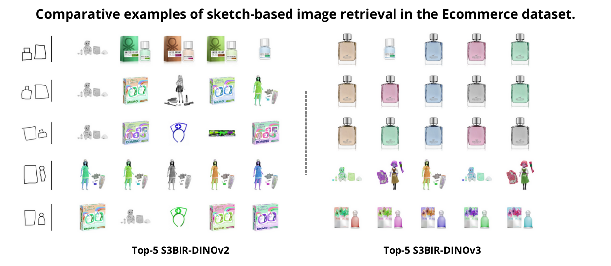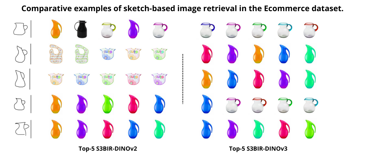 Additionally, the comparative visual examples illustrate the quality of the retrieved images given a sketch query. We compare the top-5 results obtained with S3BIR-DINOv2 and S3BIR-DINOv3 on the Flickr15K and eCommerce dataset, highlighting the superior semantic alignment and precision achieved by our new model.
